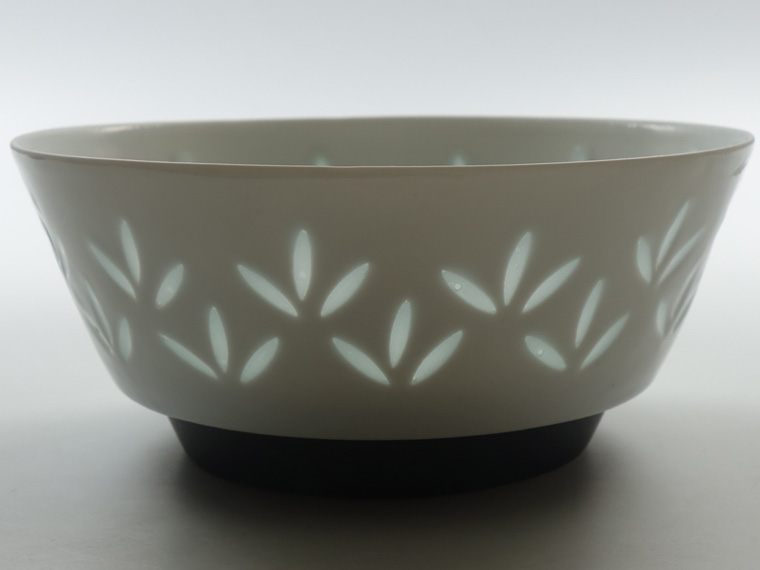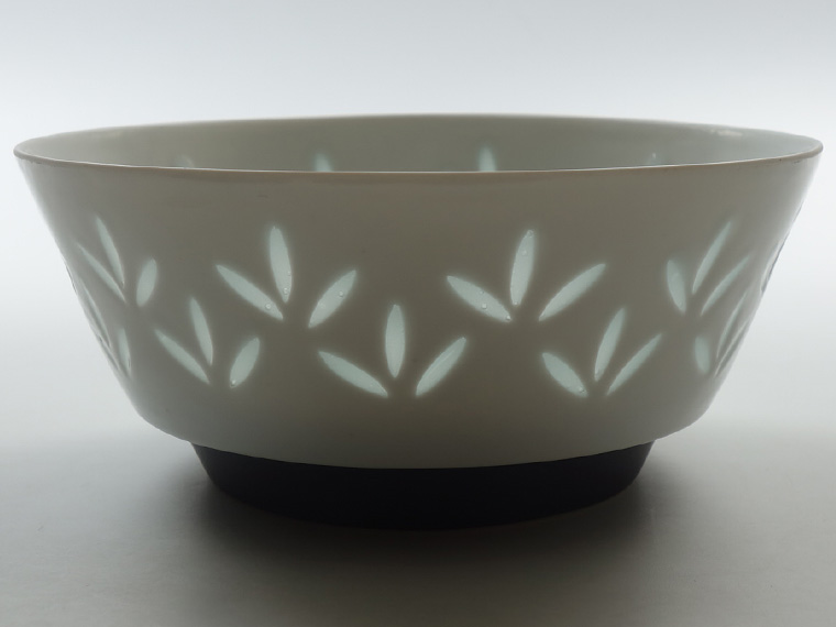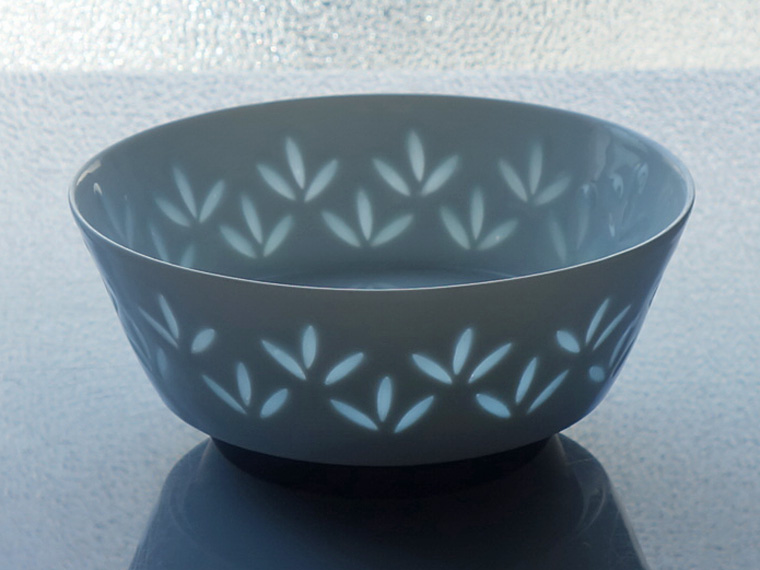 中国の陶磁器の蛍手(ほたるで)という技法を参考にしたと思われ、逆光や上からの光で文様が美しく浮かび上がります。