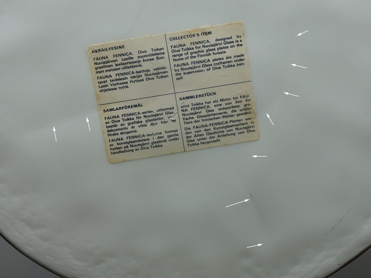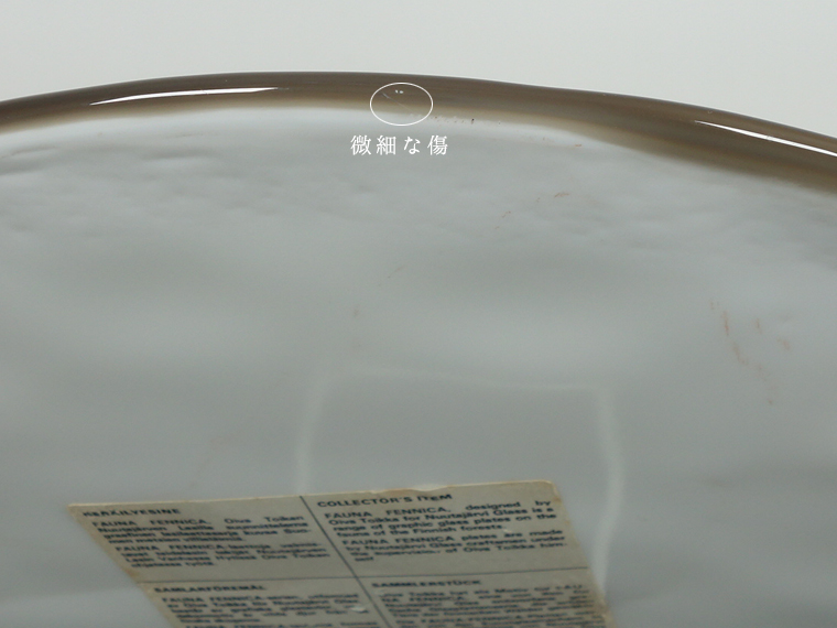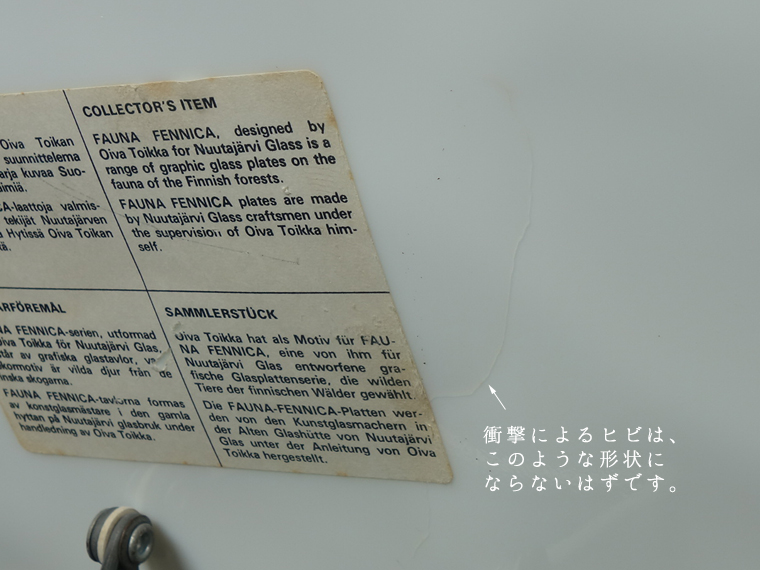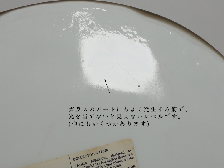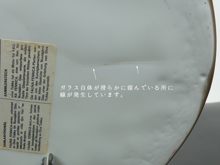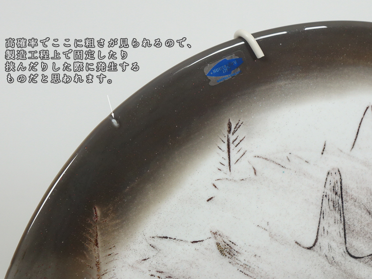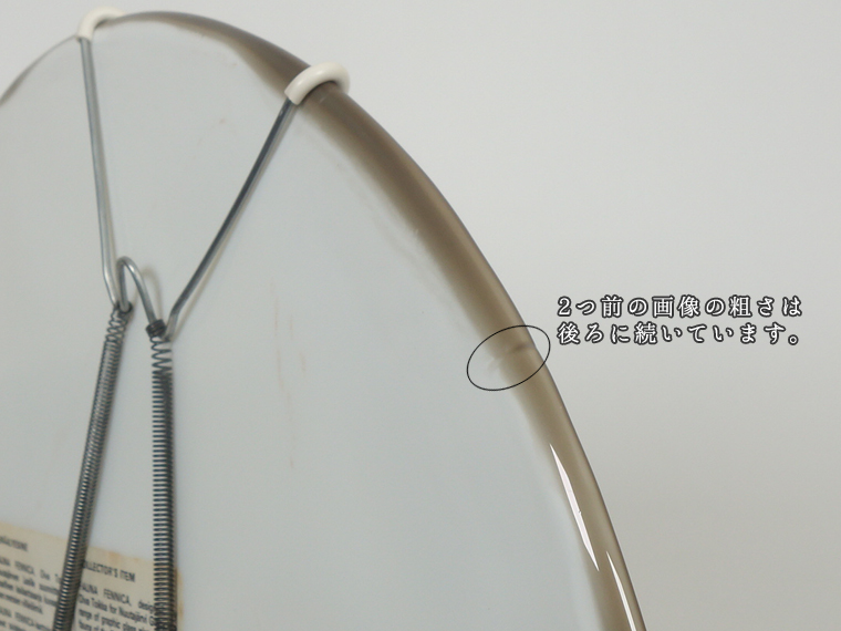 裏面に、一見ヒビのような線があります。 爪は軽く引っ掛かるものの、直線的な線はちょうど滑らかな窪みの部分であることや、曲がっている線の形状からしてヒビとは思えません。 製造方法の詳細はわかりませんが、陶磁器の釉薬に発生する貫入のようなもので、製造時の膨張・収縮によって発生したのではないかと思われます。 裏面に浅く入ったもので表には見られず、力を入れても割れたり剥がれたりする脆さは感じられないので、心配はいらないでしょう。 とはいえ、敬遠されると思われるため、30%以上割引した価格としました。 傷はわずかです。 | |