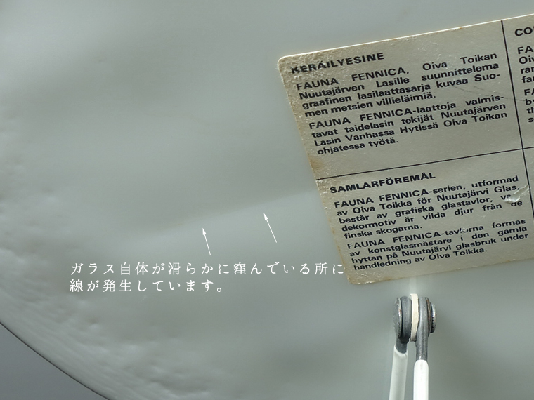 ホワイトとダークブラウンが基調ながら色の個体差が大きく、ものによって所々に見えるレッドやブルー・グリーンなどの色は他のOiva Toikkaのデザインを彷彿とさせます。
