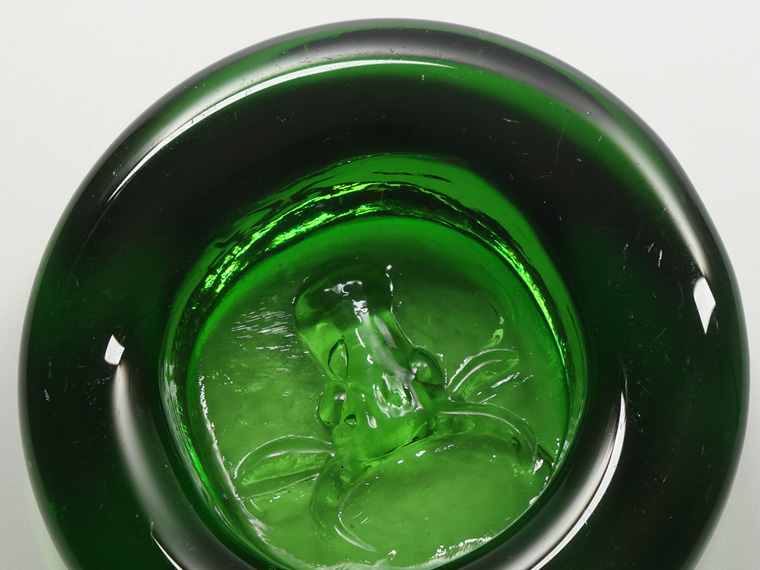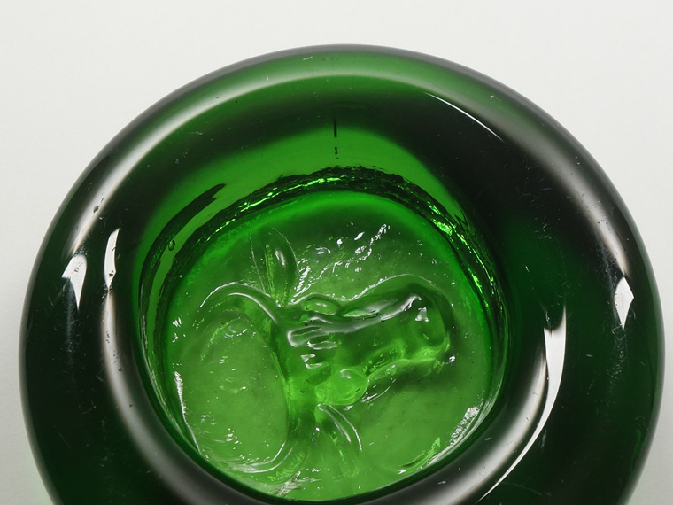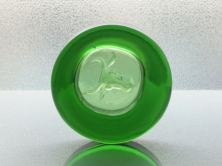 型に入れたガラスにモチーフを押し当てて製作したもので、ガラスの厚みや盛り上がり・モチーフの位置などがそれぞれ異なります。