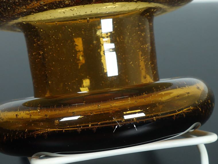 大きめの気泡の破れがあるのを少し考慮した価格。 破れた気泡のフチは少々ガリガリしますが、触っても怪我をするほどではありません。 外側の傷は少なく(画像以外にもあります)、全体的に良好なヴィンテージコンディションです。 | |