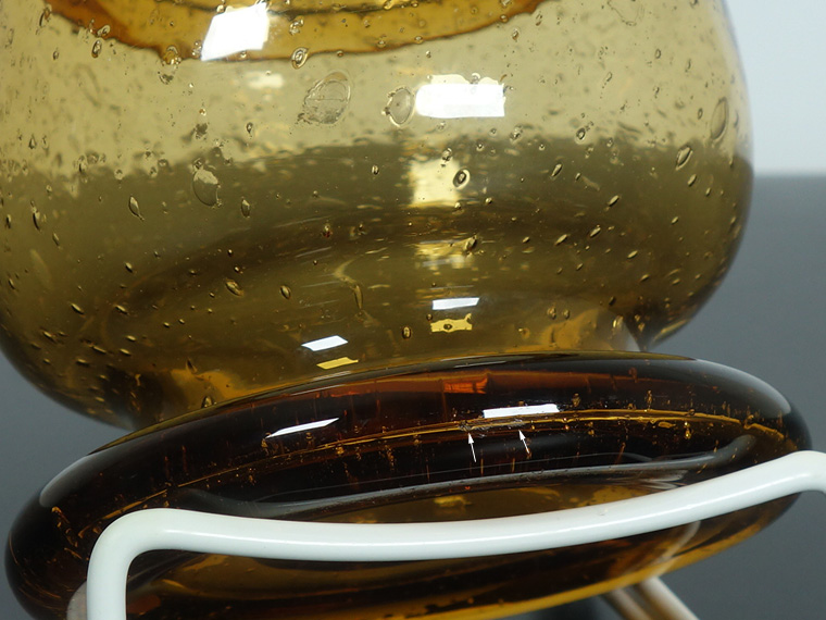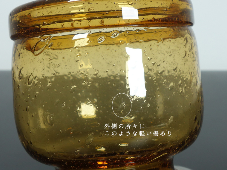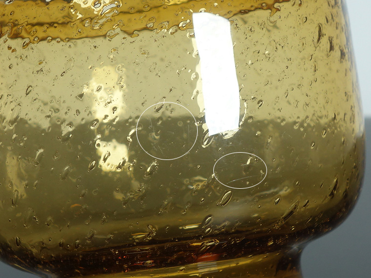 気泡の破れや破れかけ、濁った気泡があるのを考慮した価格。 破れた気泡のフチは少々ガリガリしますが、触っても怪我をするほどではありません。 外側の傷は少なく(画像以外にもあります)、全体的には良好なヴィンテージコンディションです。 | |