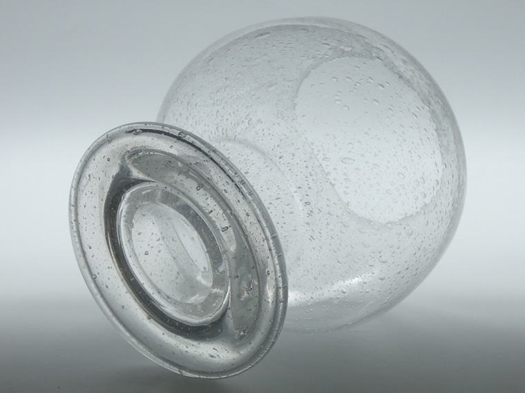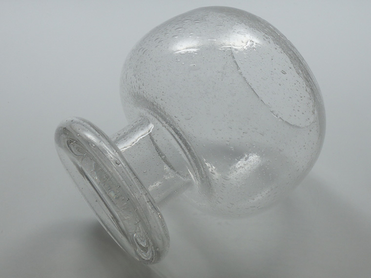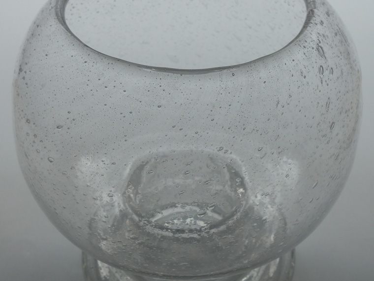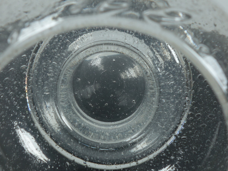 外側に少々の傷(画像以外にもあります)、内側に小さな気泡の破れかけがありますが、全体的に良好なヴィンテージコンディションです。 上部が少し傾いているのを少し考慮した価格ですが、単眼(カメラ)で見た時にはわかりやすいもの。実際に両目で見た時はそれほど残念な感じはしません。 | |