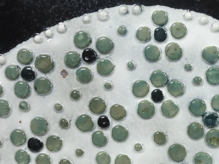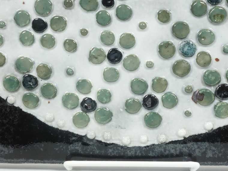 愛嬌のあるデザインで、見どころはブルーグリーン主体の粒模様。