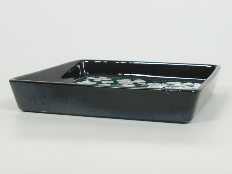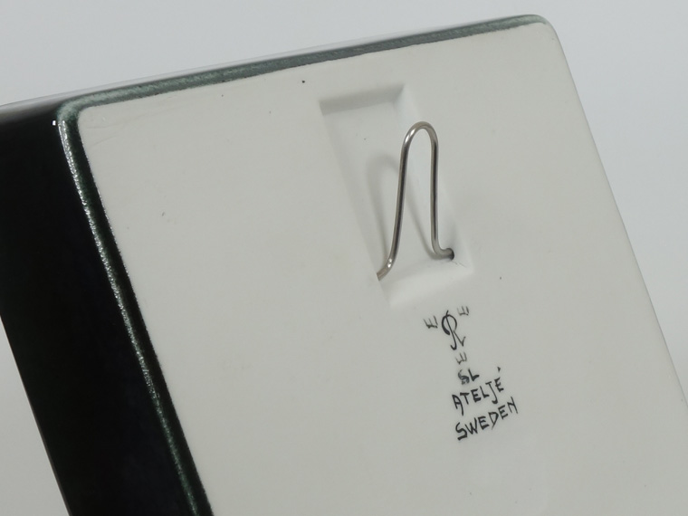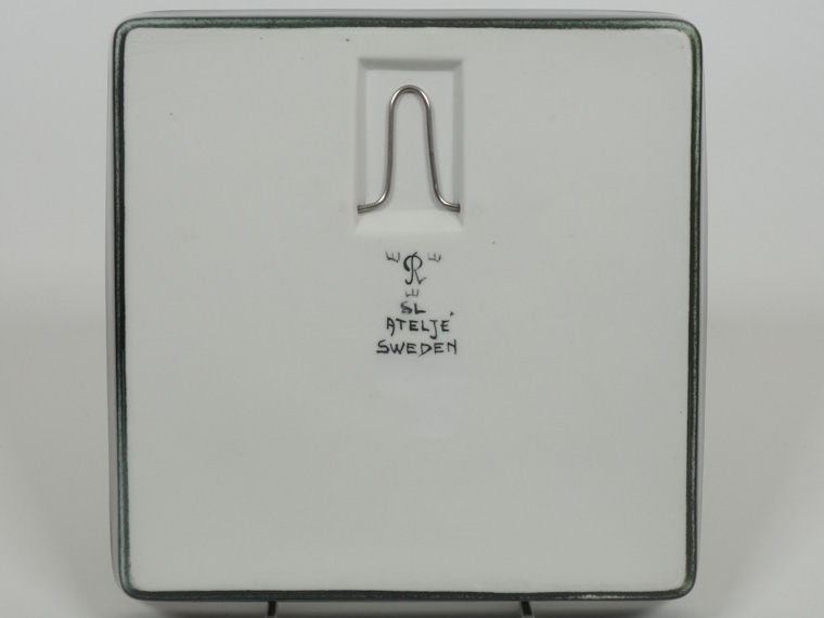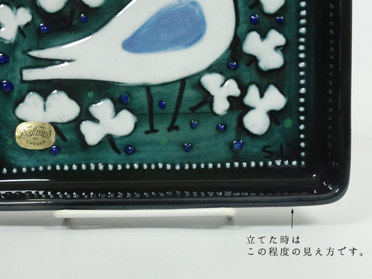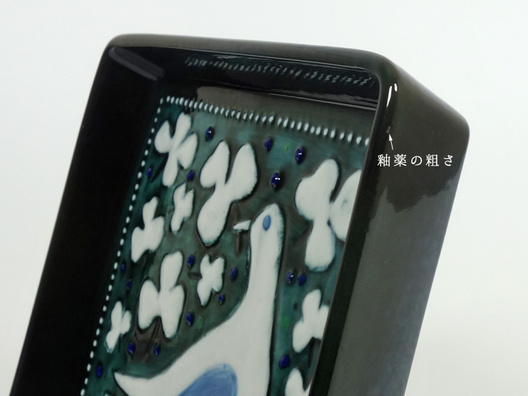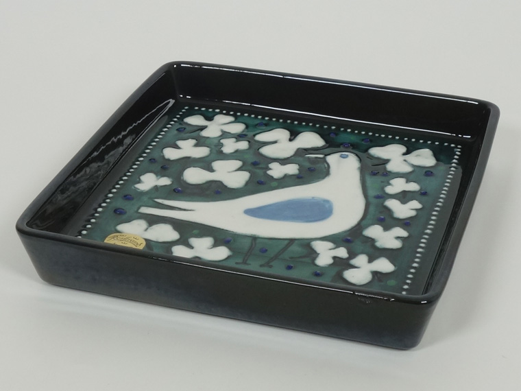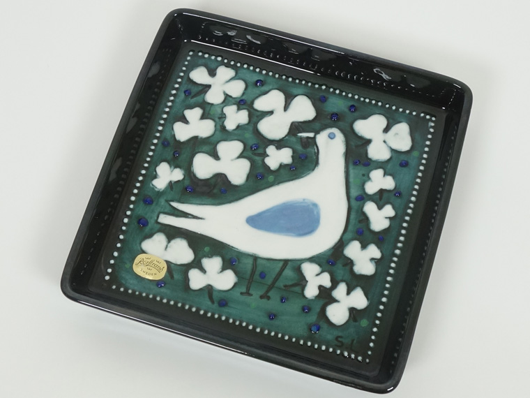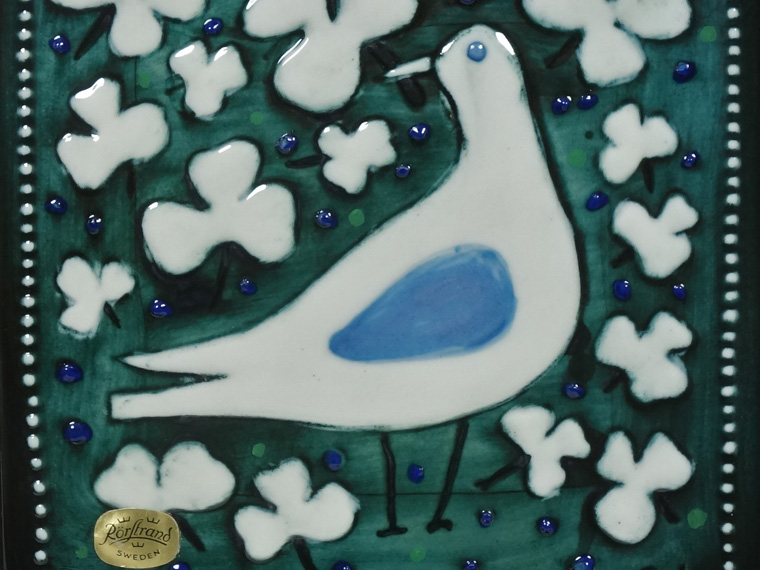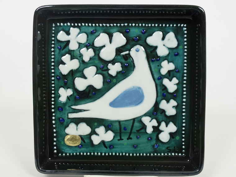 1970年代にRörstrand社のアトリエで制作されたもので、深い緑色に白い鳥とクローバーのような葉が映えるデザイン。