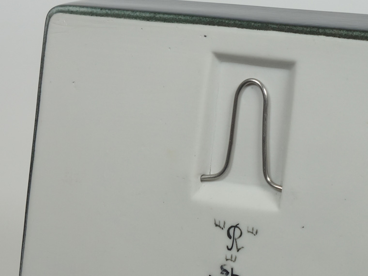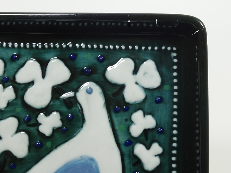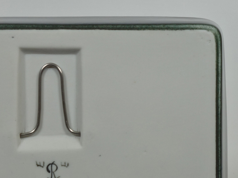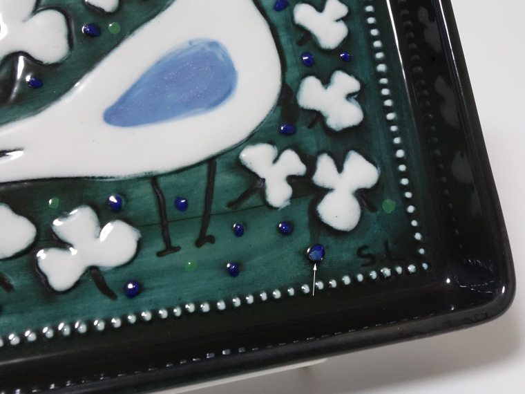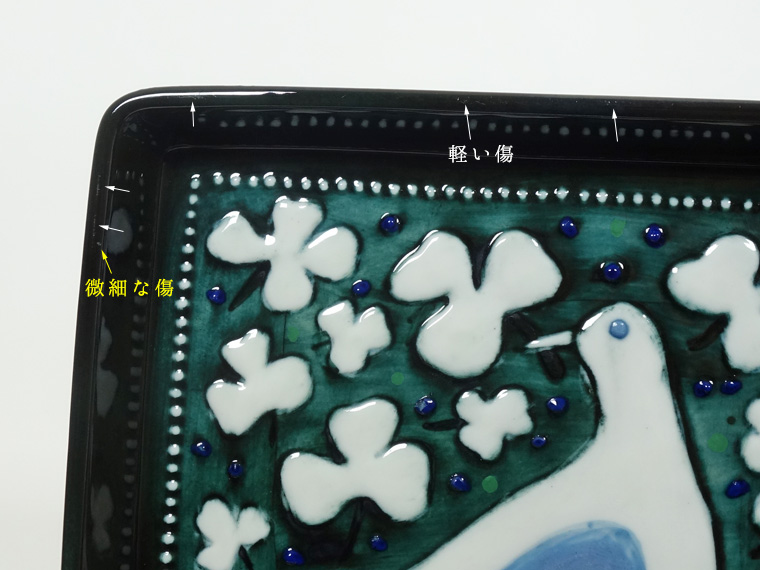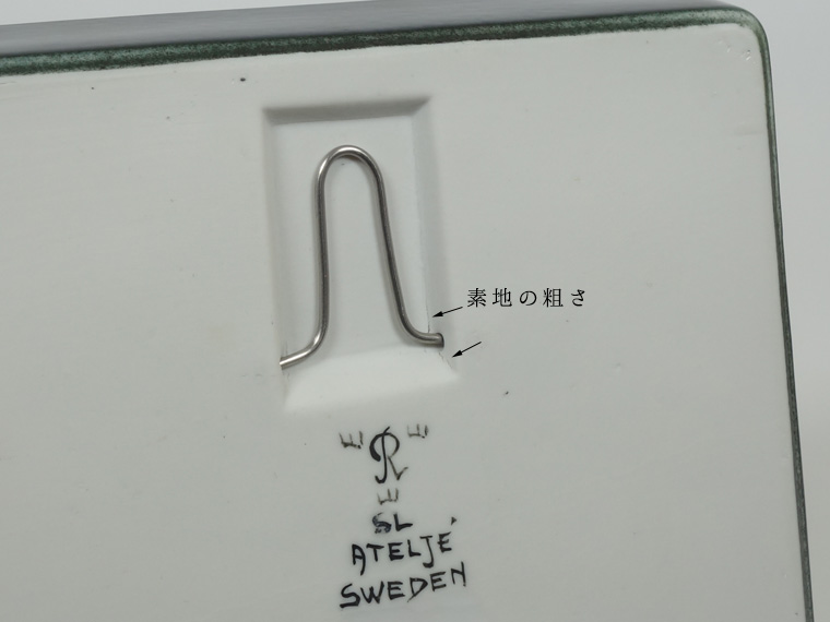 | コンディション: | フチや外側に微細な軽い傷、下部フチに釉薬の粗さ、青い粒に粗さがあるのを少々考慮した価格。 全体的に良好なヴィンテージコンディションです。 フックの差し込み穴周りに筋状の粗さがありますが、製造上高確率で発生するもの。表面的で強度に心配はありません。 裏のサイン下に削れがありますが、おそらくシリアルナンバーを入れた後、上述のようにシリアルナンバー無しで売り出すためか、何らかの事情で削ったのでしょう。作りからしてもB級品という意味では無いと言えます。 |