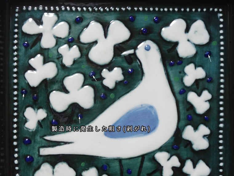 少し青寄りの緑色はハンドペイントで、鳥と葉の輪郭も素朴な雰囲気。