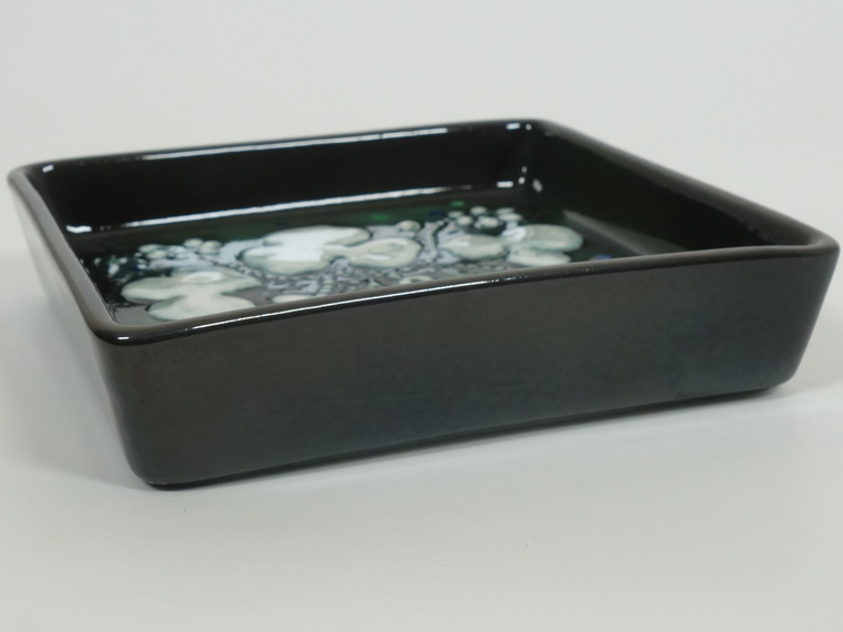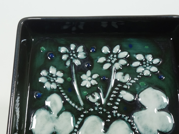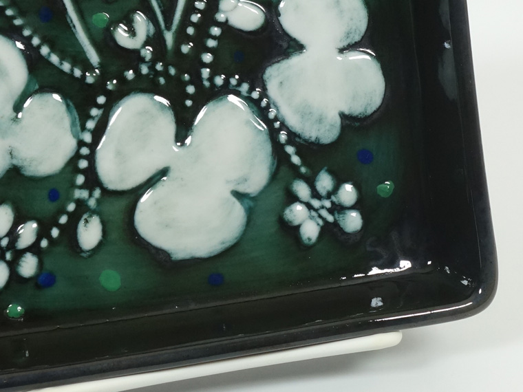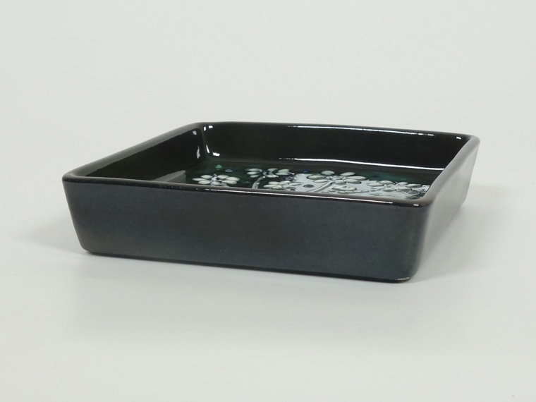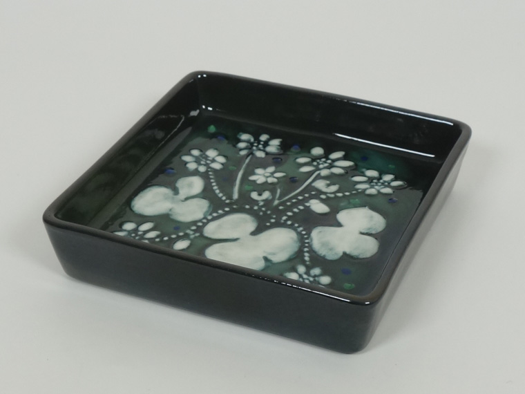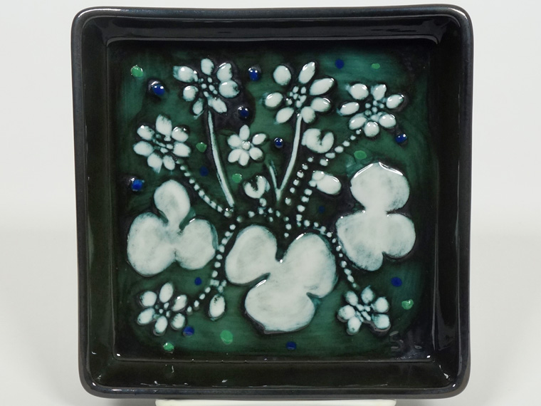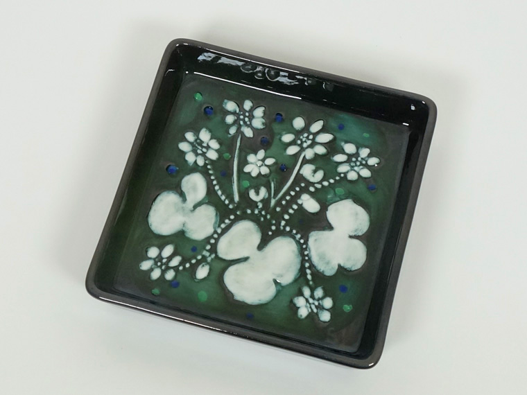 1970年代にRörstrand社のアトリエで制作されたもので、深い緑色に白い花と葉が映えるデザイン。