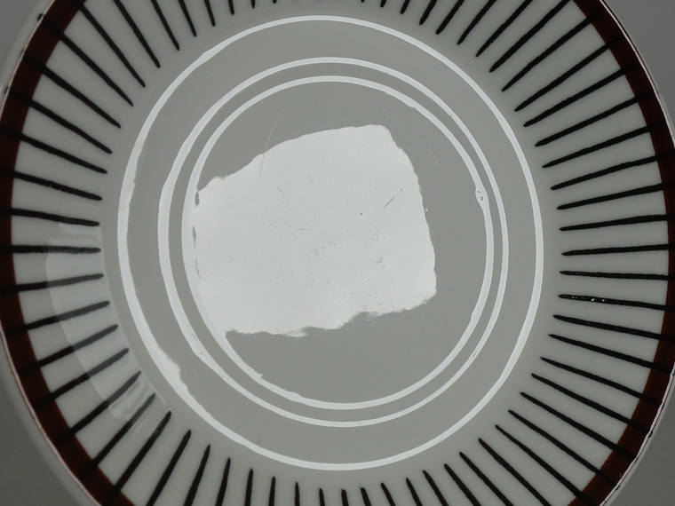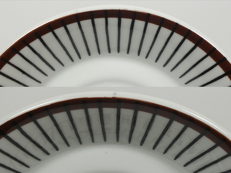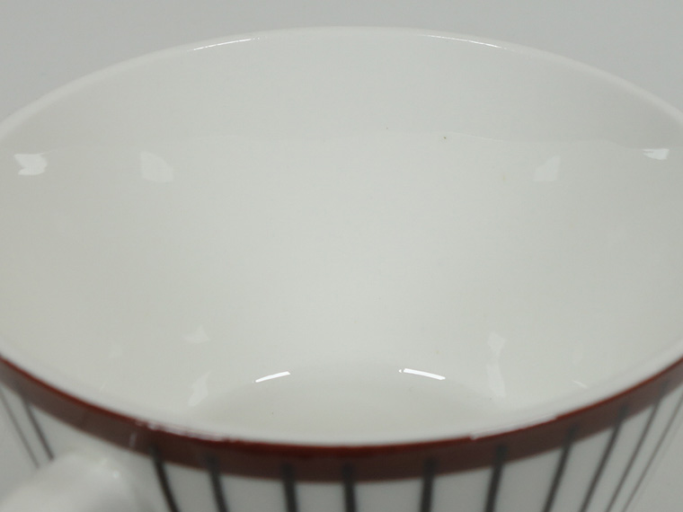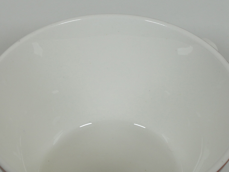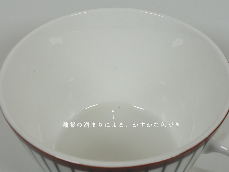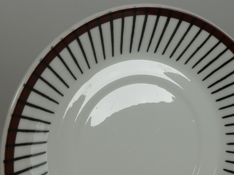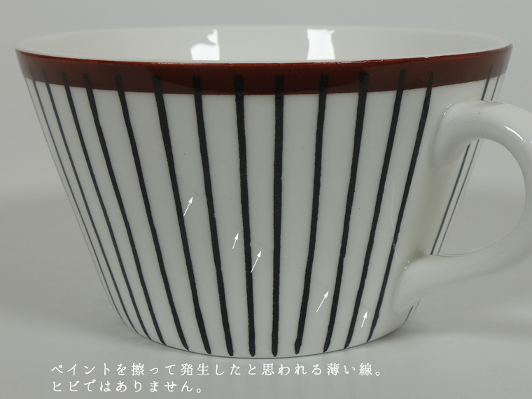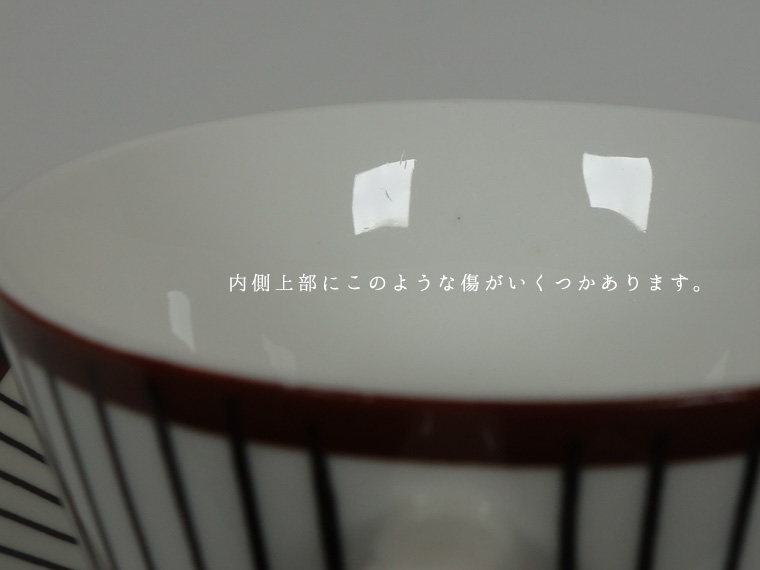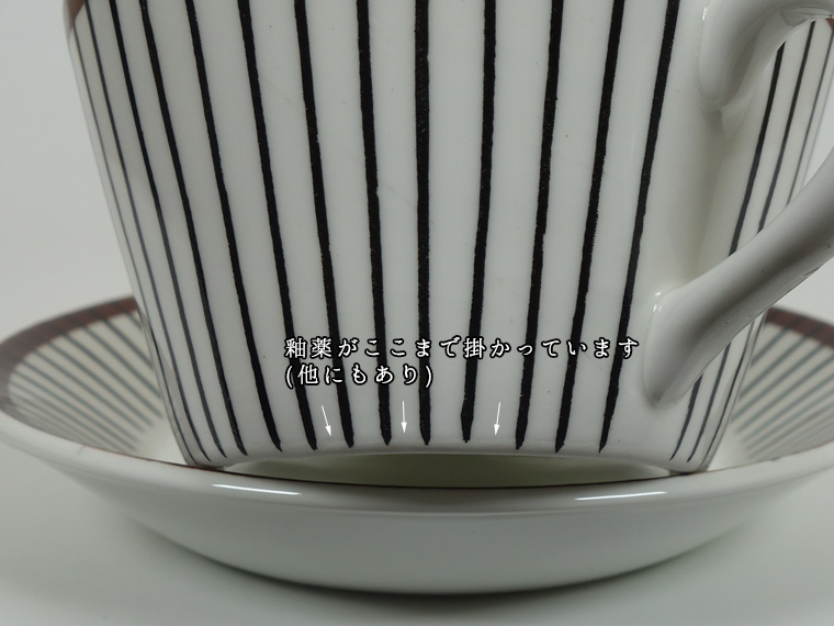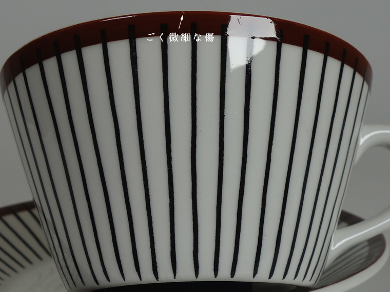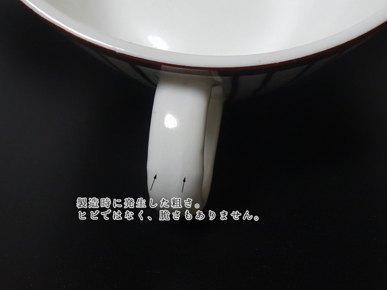 | コンディション: | カップフチの釉薬の粗さ、カップ正面の斜めの薄い線、ソーサーフチの支柱跡の大きめの凹みなど、作りの粗さを考慮した価格。 カップ内外・ソーサー表面に少々の傷はありますが、全体的な使用感は少なめで、全体的に良好なヴィンテージコンディションです。 | |