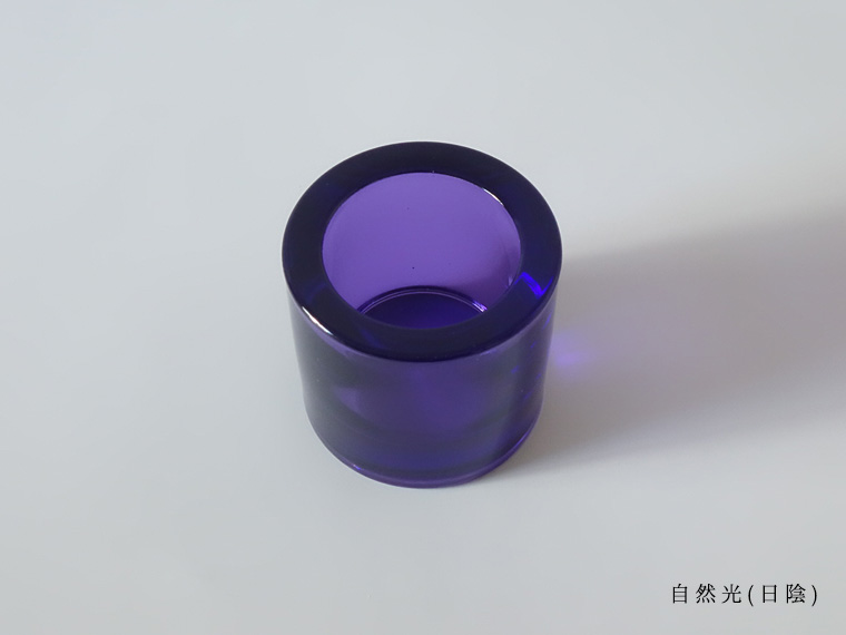 アメジストカラーのように光の種類で色が変わり、自然光や白熱灯など赤色の波長が含まれる光だと紫色に、蛍光灯では赤味が消えて青く見えます。