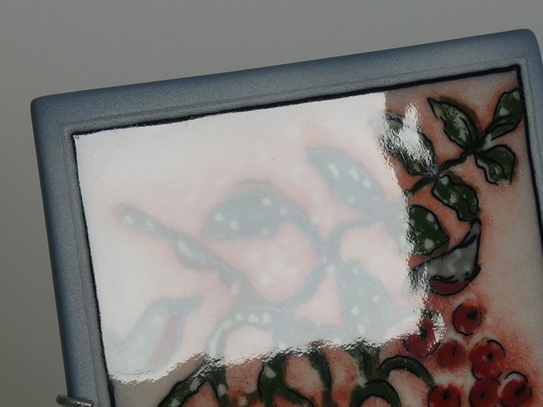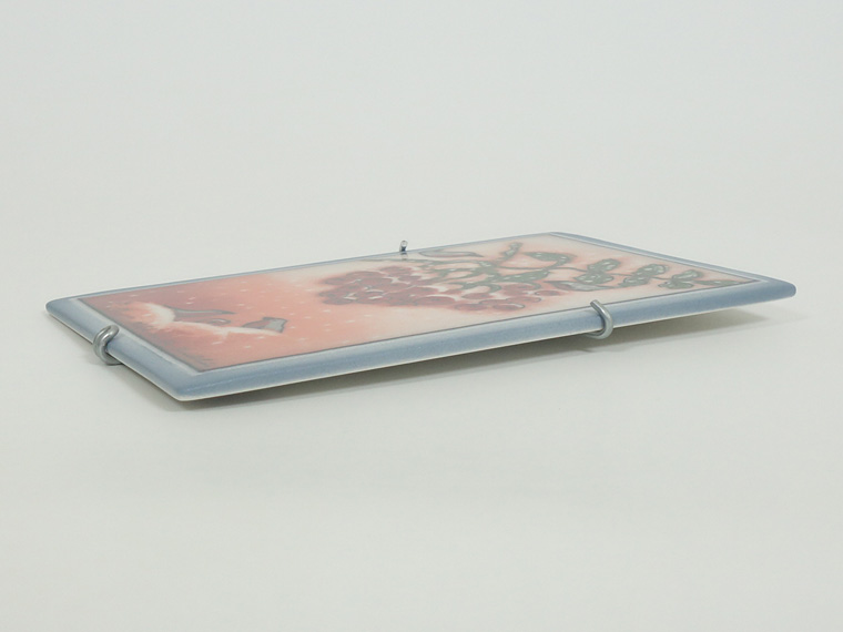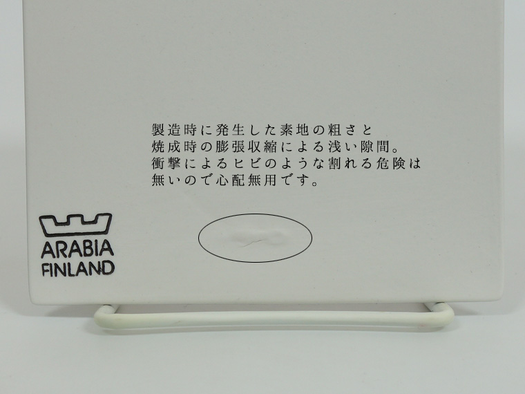 | 注意事項: | ※微細な点や付着物、気泡跡、素地や釉薬の粗さ、プリントの粗さ、フォルムの歪みなどが発生しやすいですが、全ての画像を用意したり説明したりしませんのでご了承ください。 ※フチや裏面は釉薬が掛かっていないため、付属の金具が当たって銀色の金属汚れが付着しやすくなっています(メラミンスポンジなどである程度は落とせます)。 |